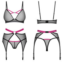 Трискладовий набір з колекції Novenes вражає та захоплює своїм чуттєвим дизайном. Складається з бюстгальтера, стрінгів та пояса для панчіх. Виготовлений з чорного, ніжного, прозорого матеріалу, прикрашений фіолетовими акцентами та блискучими деталями. Ідеальне прилягання гарантує привабливий вигляд і комфорт у користуванні. Цей чорний комплект жіночої білизни є пропозицією для жінок, яким близькі чуттєві експерименти. Перевір сама, яка в ньому сила!