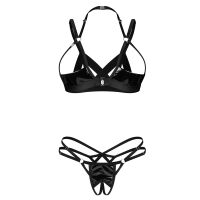 Відкритий бюстгальтер і стринги – сміливий комплект, який розпалює уяву.
