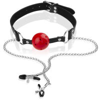 Вам нравятся более жесткие игры, доминирование, желание получать больше удовольствия? Если это так, этот набор будет идеальным для вас! Комплект БДСМ, который включает в себя: шариковый кляп, соединенный цепями с зажимами для сосков. Эти зажимы можно регулировать. Интенсивная стимуляция и максимальные ощущения гарантированы.