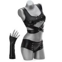 Еротичний комплект жіночої білизни з матеріалу, який дає ефект вологої шкіри. Сексуальний, зав'язувальний топ, вирізані шорти та спокусливі рукавички. Набір буде чудово виглядати з взуттям на високій платформі, а весь ансамбль ідеально доповнить батіг та маска для очей - стилізація для впевненої в собі, домінуючої жінки-вамп. Топ має модне, витончене зав'язування, яке чуттєво підкреслює талію, а через м'який матеріал легенько просвічуються соски, посилюючи бажання. Шорти покроєні так, щоб підкреслювати та експонувати сідниці, даючи простір для соковитих шльопків. Долучені до комплекту рукавички додають всьому комплекту шику та елегантності, а з краплею уяви ви можете використовувати їх для прелюдії чи петінгу.