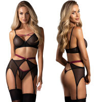 Трискладовий набір з колекції Novenes вражає та захоплює своїм чуттєвим дизайном. Складається з бюстгальтера, стрінгів та пояса для панчіх. Виготовлений з чорного, ніжного, прозорого матеріалу, прикрашений фіолетовими акцентами та блискучими деталями. Ідеальне прилягання гарантує привабливий вигляд і комфорт у користуванні. Цей чорний комплект жіночої білизни є пропозицією для жінок, яким близькі чуттєві експерименти. Перевір сама, яка в ньому сила!