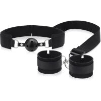 Кляп с шариком крепится вместе с наручниками. Набор позволяет вам доминировать над вашим партнером и контролировать его свободу. Свяжите его в любой позиции и наслаждайтесь властью над его телом и ощущаемым вами двумя наслаждением. Покоренный любовник не сможет прикоснуться к вам, не сможет стонать от удовольствия, что зажжет огонь между вами и позволит вам полностью наслаждаться сексом со всеми вашими чувствами. Кляп и наручники полностью регулируются липучкой, длина ремня, соединяющего их вместе, также регулируемая. Набор изготовлен из приятной на ощупь пенки и посконной ленты.